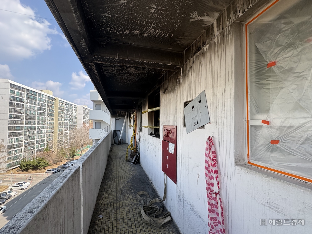 화재 이후 복구 작업도 아직 완전히 마무리되지 않았다. 불이 난 동의 8층 복도 천장은 시커먼 그을음이 그대로 남아 있었다.