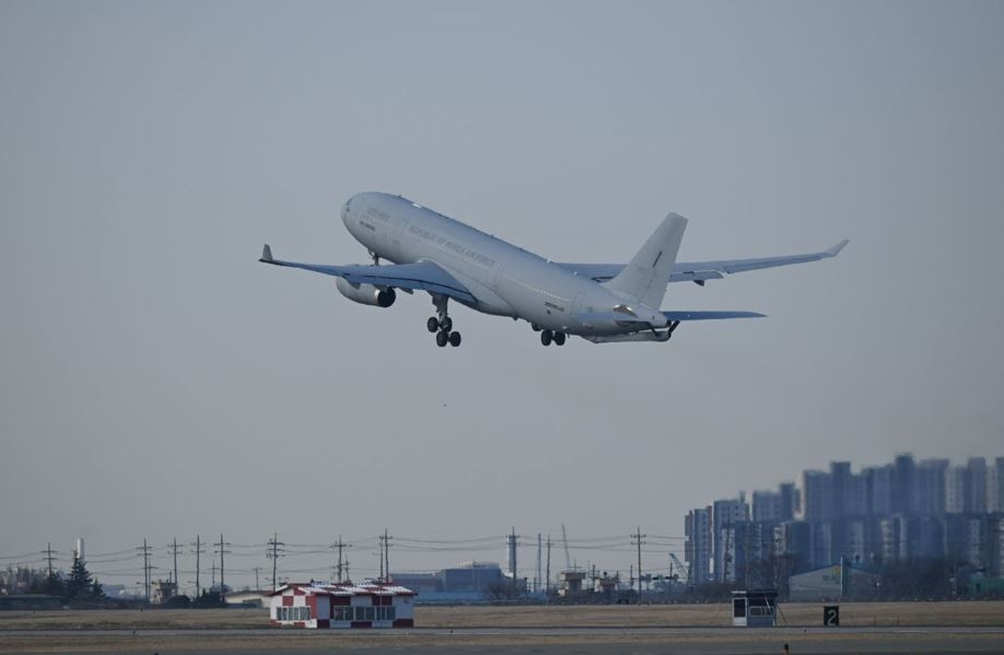 | 정부는 중동 상황을 피해 사우디아라비아 리야드 공항에서 출발한 우리 국민 204명이 15일 오후 도착한다고 밝혔다. 이른바 ‘사막의 빛’ 작전으로, 이번 작전에 투입된 군 수송기(KC330)가 날아오르고 있다. [외교부 제공] |