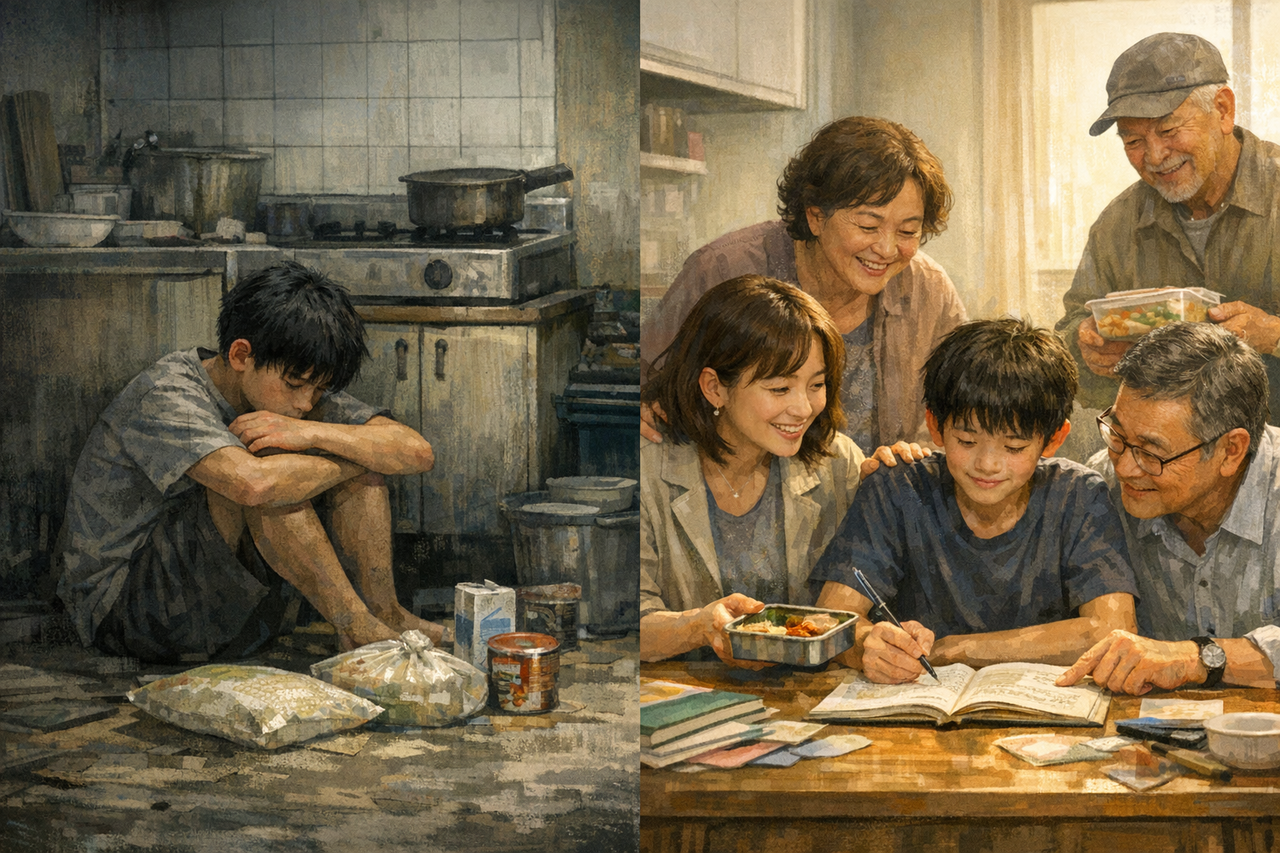 | 가난한 시절과 주변의 도움을 받는 상반된 모습을 표현한 그림. [챗GPT를 통해 제작] |