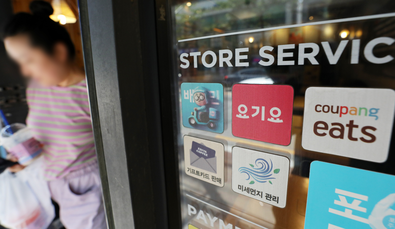 | 서울 강서구의 한 음식점 앞에 배달앱 스티커가 붙어있다. [뉴시스] |