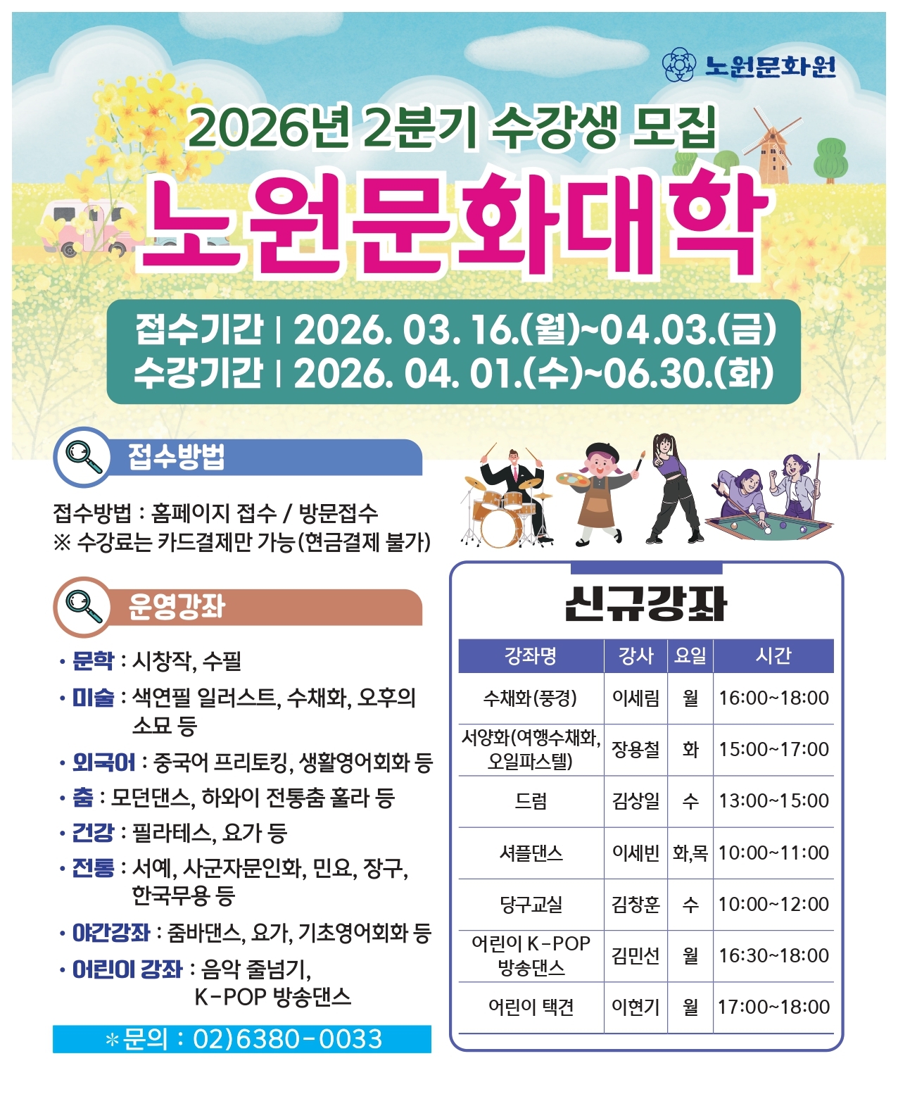 특히 미술 분야에서는 여행수채화와 오일파스텔 등 서양화 강좌와 풍경 수채화 과정을 새롭게 개설했다. 중·장년층의 여가 활동을 위한 당구와 드럼 강좌도 신설, 최근 다양한 연령층에서 인기를 얻고 있는 셔플댄스 강좌도 도입했다.