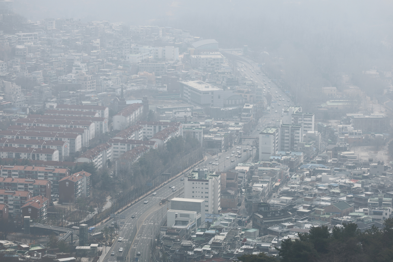 | 서울을 비롯한 수도권 등 지역 초미세먼지 농도가 ‘나쁨’ 수준인 15일 서울 남산에서 바라본 서울 시내가 뿌옇다. [연합] |