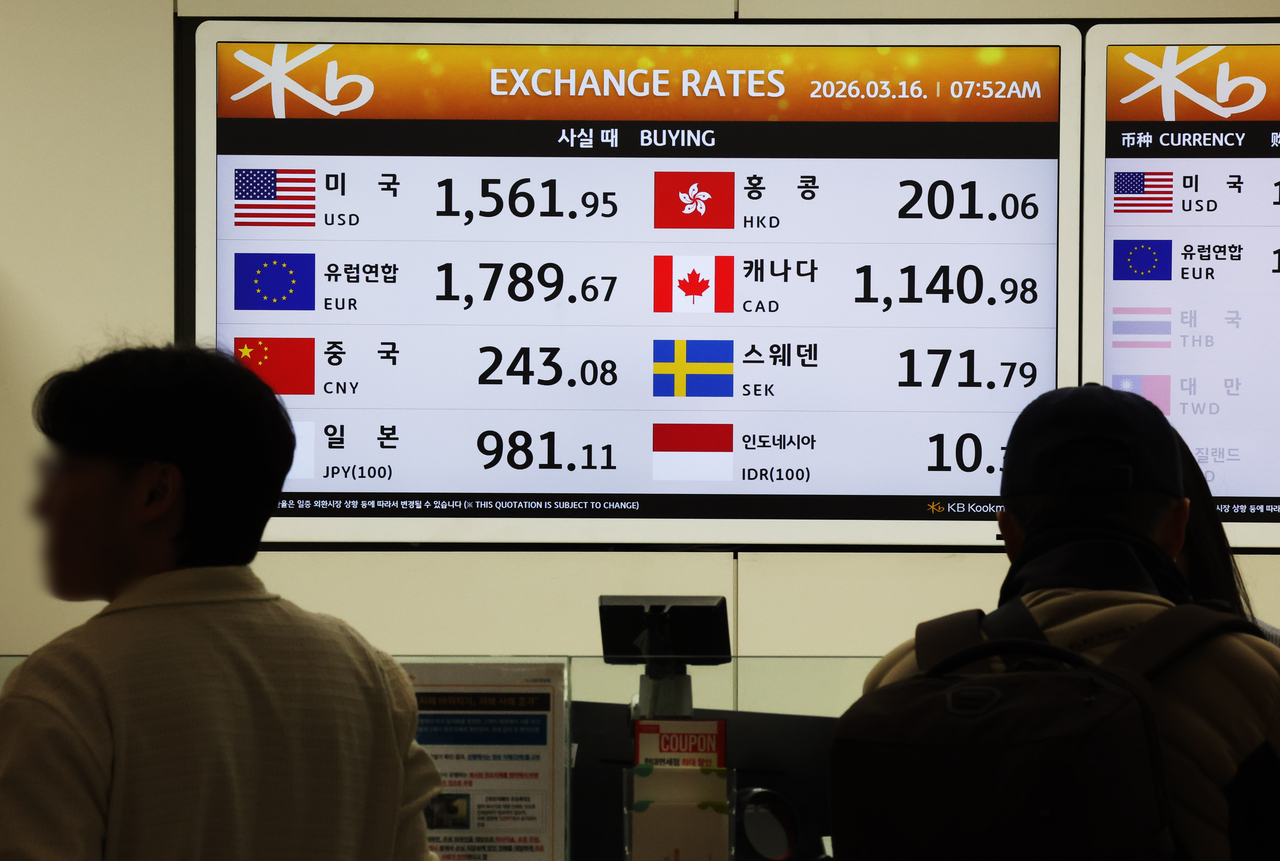 | 미국-이란 전쟁 여파로 16일 원/달러 환율이 전 거래일 주간 거래 종가보다 7.3원 오른 1501.0원으로 출발했다. 환율 개장가가 1500원을 넘은 것은 금융위기 당시인 2009년 3월 10일 이후 처음이다. 이날 오전 인천국제공항 환전소에서 1달러에 1561.95원의 매입 환율이 표시돼 있다. [뉴시스] |