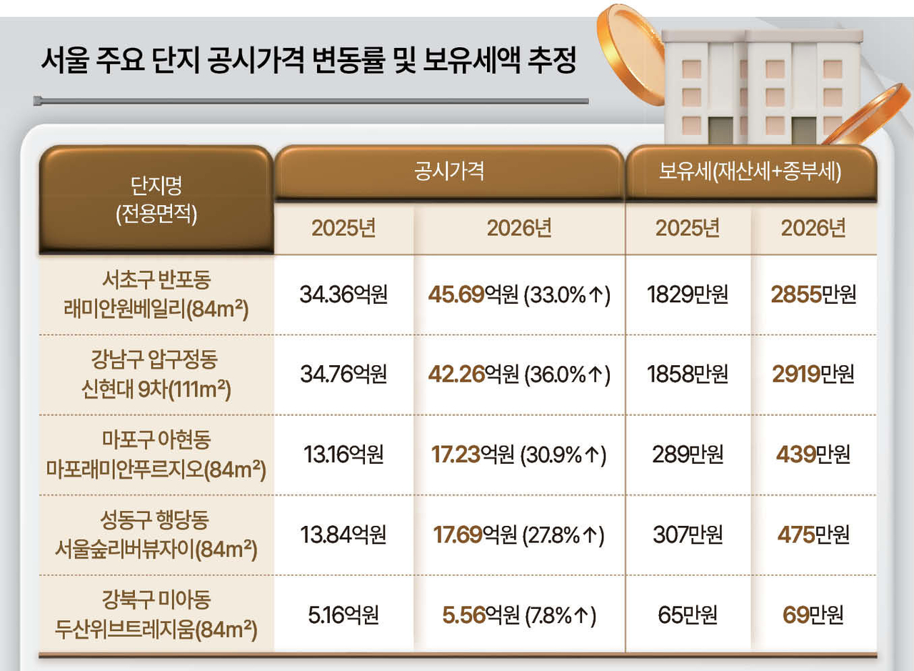 ▶강남은 ‘최대 50%’ 한도까지 상승…원베일리 1000만원 더 내야=집값 오름폭이 컸던 고가주택 밀집지역에선 보유세 상승폭이 더 두드러졌다. 실제 강남(26.05%)·송파(25.49%)·서초(22.07%) 등 강남3구의 공시가격 상승률이 24.7%를 기록했다. 서울에서 가장 많이 오른 성동(29.04%)을 비롯한 용산(23.63%)·마포(21.36%) 등 한강벨트의 상승세도 두드러졌다.