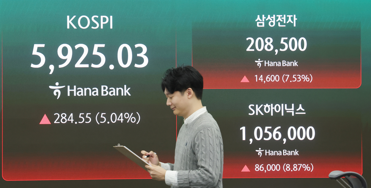 | 코스피가 5% 넘게 급등해 5900선을 재돌파한 18일 서울 중구 하나은행 딜링룸에서 직원들이 업무를 보고 있다. 이날 코스피는 전장보다 284.55포인트(5.04%) 오른 5925.03에 거래를 마감했다. [연합] |
