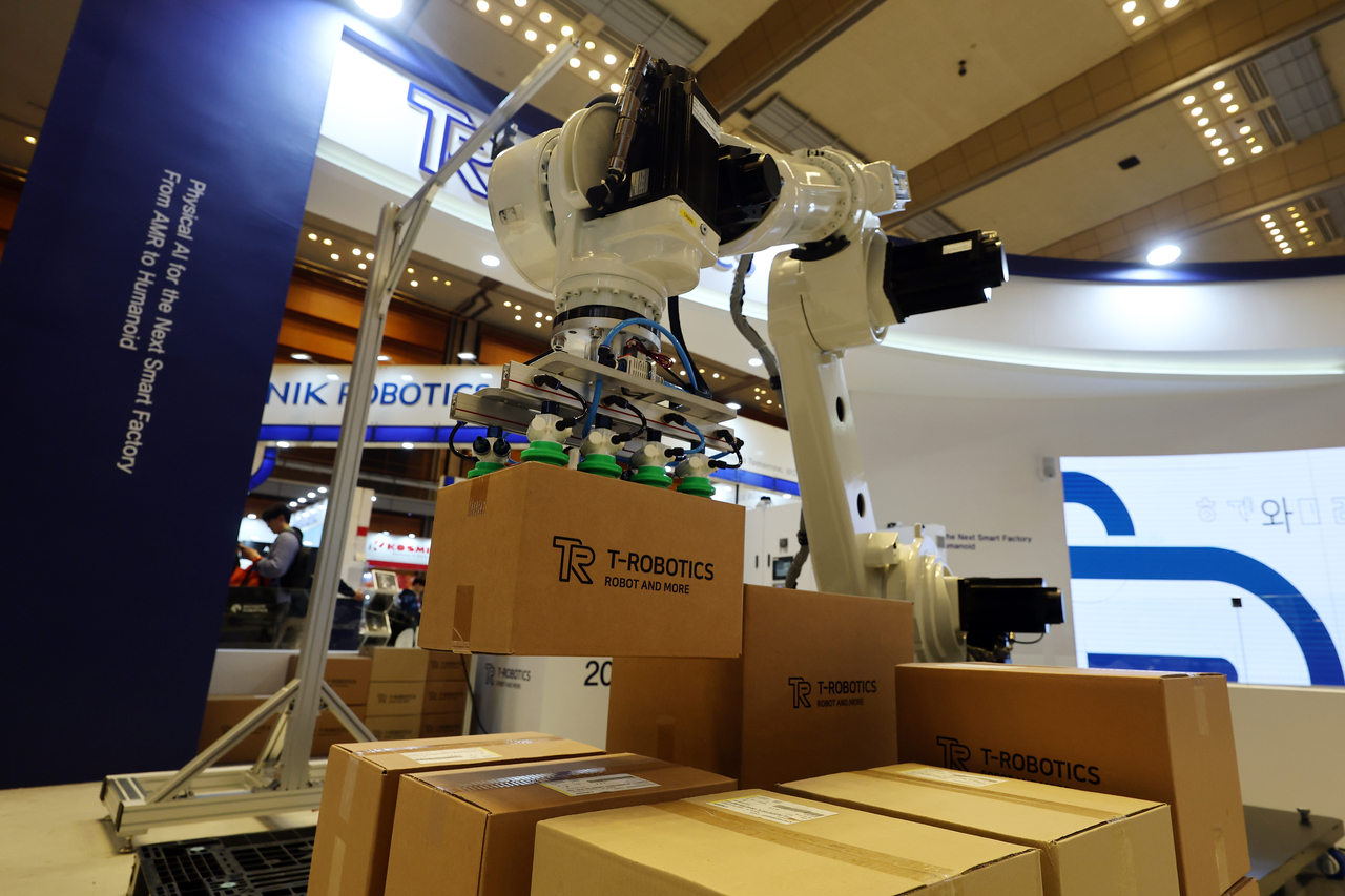 | 4일 코엑스에서 열린 2026 스마트공장·자동화산업전에서 수직다관절로봇이 박스를 분류하고 있다. [연합] |