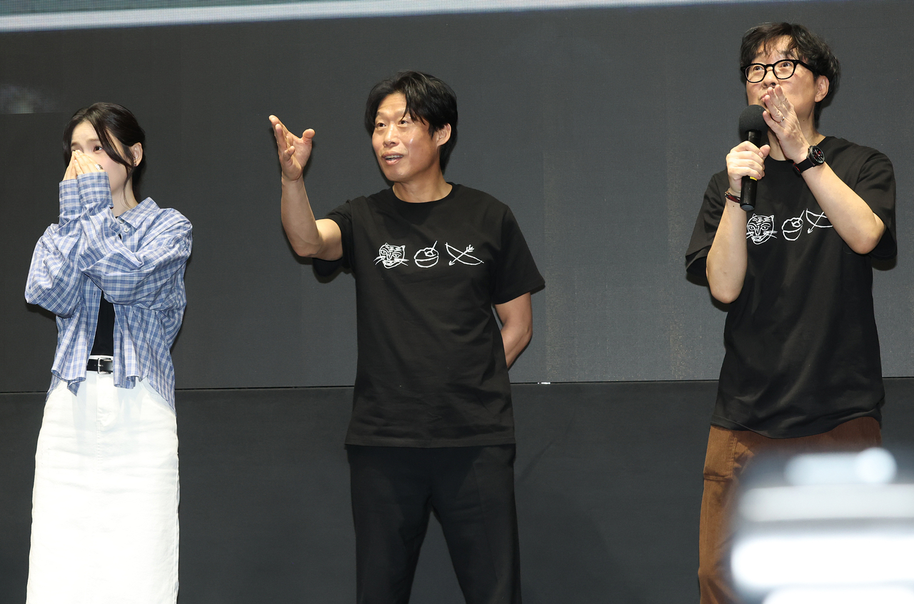 | 배우 전미도(왼쪽부터), 유해진, 장항준 감독이 지난 17일 서울 강남구 메가박스 코엑스에서 열린 영화 ‘왕과 사는 남자’ 흥행 감사 무대인사에서 선물 증정을 위한 관객 추첨을 하고 있다. [연합뉴스] |
