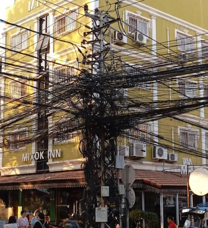 세타틸라트 로드와 노케오쿠만 로드가 만나는 교차로에 자리 잡은 이 전봇대에는 일반 전력선 외에도 다양한 통신선이 포함돼 있다. 도시 발달과 함께 배선이 추가되면서 도심 한복판에 독특한 경관이 됐다.