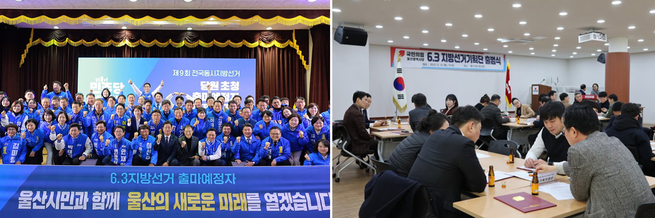 | 울산 지역 6·3 지방선거 5개 구·군 기초단체장 후보가 각 당별로 발표되고 있다. 사진은 더불어민주당 울산시당의 당원초청 출마예정자 비전발표회(왼쪽)와 국민의힘 울산시당 지방선거 기획단 출범식(오른쪽) 모습 [민주당·국민의힘 울산시당 누리집] |