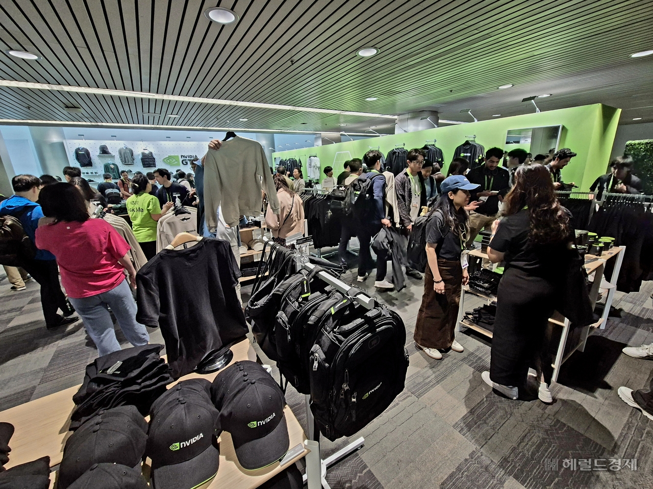 팬덤을 몰고 다니는 젠슨 황 최고경영자(CEO)의 인기를 반영한 듯 그의 캐리커처가 인쇄된 초록색 스웨터는 178달러(약 26만원)에 판매 중이었다. 남녀 가릴 것 없이 실제 구매하는 사람들이 적지 않았다.