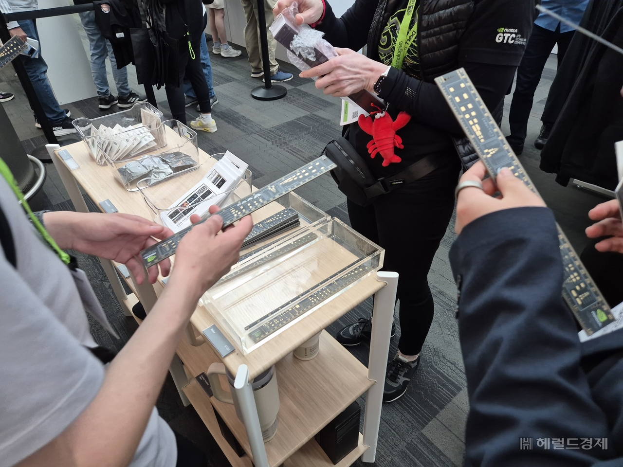 | 엔비디아가 인쇄회로기판(PCB)을 형상화해 만든 30㎝ 자를 관람객들이 들여다보고 있다. 7달러에 판매 중이다. 김현일 기자 |