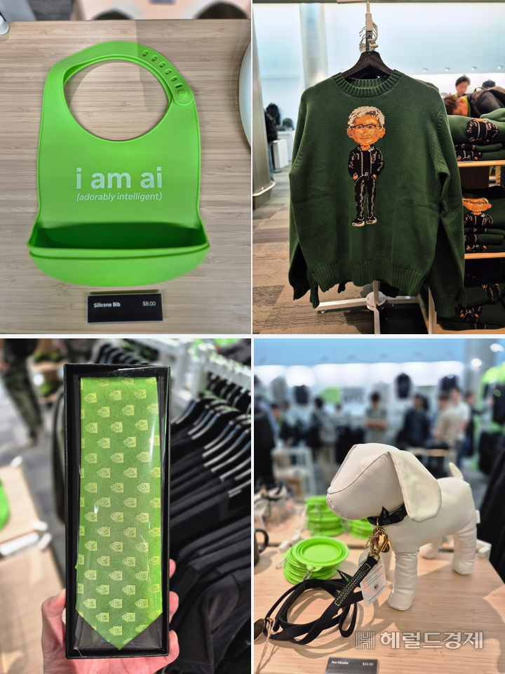 | 엔비디아는 GTC 2026 기간 미국 캘리포니아주 새너제이 맥에너리 컨벤션센터 1층에 위치한 굿즈(기념품) 매장에서 영유아용 턱받이, 젠슨 황 최고경영자(CEO)의 캐리커처가 새겨진 스웨터, 반려견 후드티·목줄, 넥타이 등을 판매했다. 김현일 기자. |
