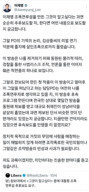 이 대통령은 “정치적 목적으로 거짓의 무덤에 사람을 매장하는 일이 재발하지 않게 하려면 조작폭로한 국민의힘이나 그알같은 조작방송의 반성과 사과가 필요하다”며 “저도 과욕이겠지만, 미안하다는 진솔한 한마디를 듣고 싶다”고 덧붙였다.