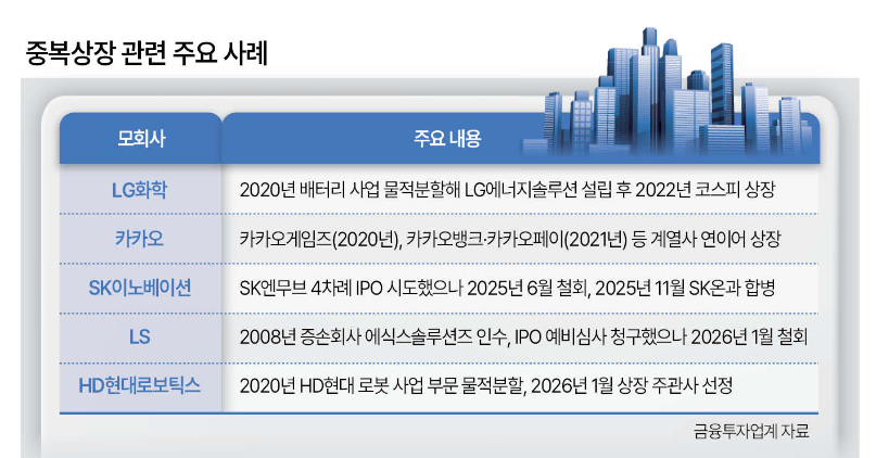 상장회사의 외부감사법상 종속회사 혹은 상장회사의 공정거래법상 계열회사로서 수직적 지배관계에 있는 회사가 중복상장 금지 대상이다. ▷상장 필요성 ▷주주 소통 ▷일반 주주 보호 ▷영업 독립성 ▷경영 독립성 등 까다로운 기준을 충족할 때만 예외적으로 허용한다. 핵심 사업을 분할한 뒤 자회사를 별도 시키는 과정에서 모회사 가치가 희석되는 ‘더블 리스팅 할인(Double Listing Discount)’ 문제를 해결하자는 취지다.