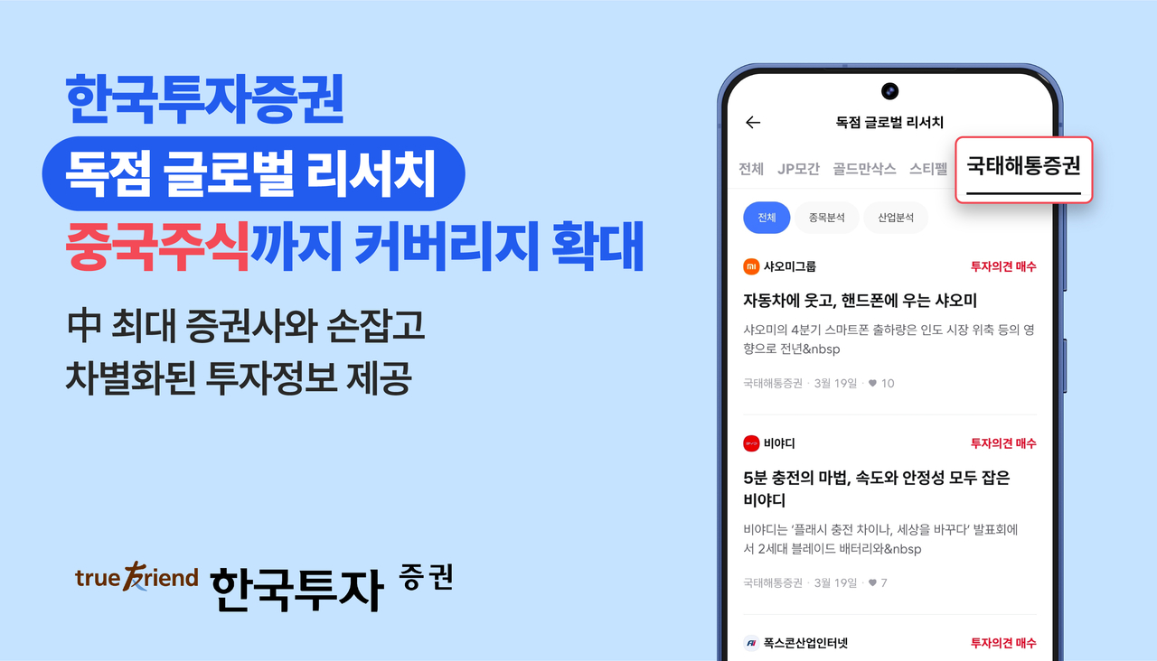 해당 서비스는 전날부터 한국투자증권 모바일 애플리케이션(앱)과 홈페이지의 ‘독점 글로벌 리서치’ 메뉴에서 확인할 수 있다. 비야디(BYD), 샤오미 등 최근 시장의 관심이 높은 주요 중국 주식 종목을 시작으로 현지 종목 및 산업 분석 리포트가 업로드될 예정이다.