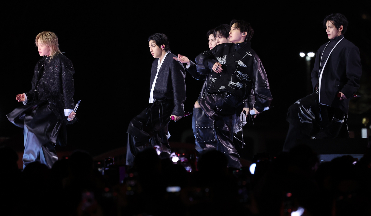 | 그룹 방탄소년단(BTS)이 21일 서울 광화문 광장에서 정규 5집 ‘아리랑’(ARIRANG) 발매를 기념해 무료 공연 ‘BTS 컴백 라이브: 아리랑’(BTS THE COMEBACK LIVE|ARIRANG)을 열고 있다. [연합] |
