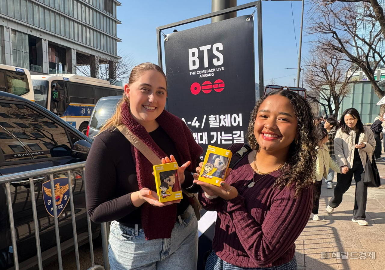 | 광화문역 인근에서 만난 데이나(미국·19), 케이던스(호주·20). 친구들의 부탁으로 BTS 인형 굿즈를 사고 현장 분위기를 페이스톡으로 전달하고 있었다. 정주원 기자 |