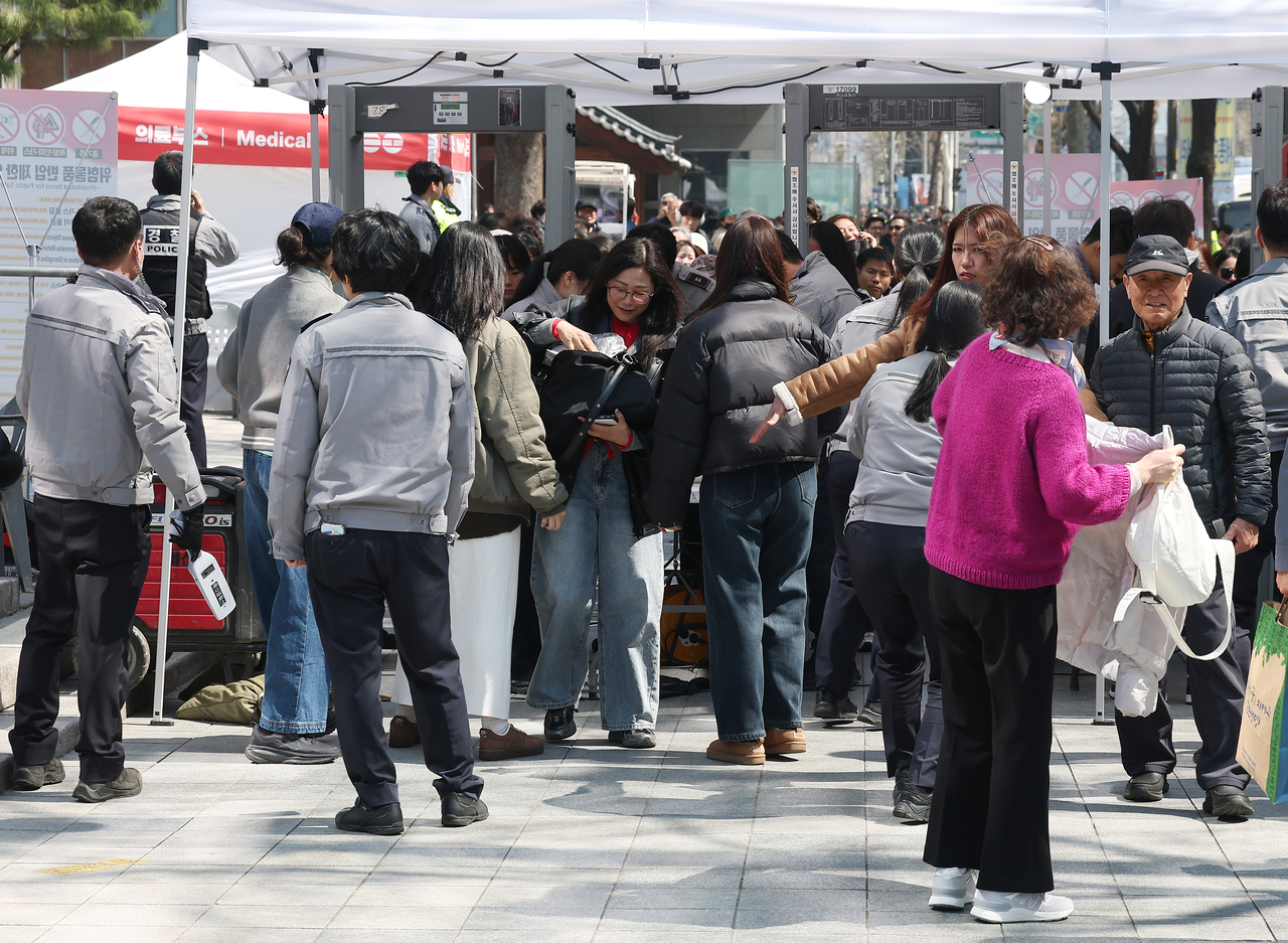 | 그룹 방탄소년단(BTS)이 정규 5집 ‘아리랑’(ARIRANG) 발매를 기념해 무료 공연 ‘BTS 컴백 라이브: 아리랑’(BTS THE COMEBACK LIVE|ARIRANG)을 여는 21일 서울 광화문 광장 출입구에서 시민들이 검색을 받고 있다. [연합] |