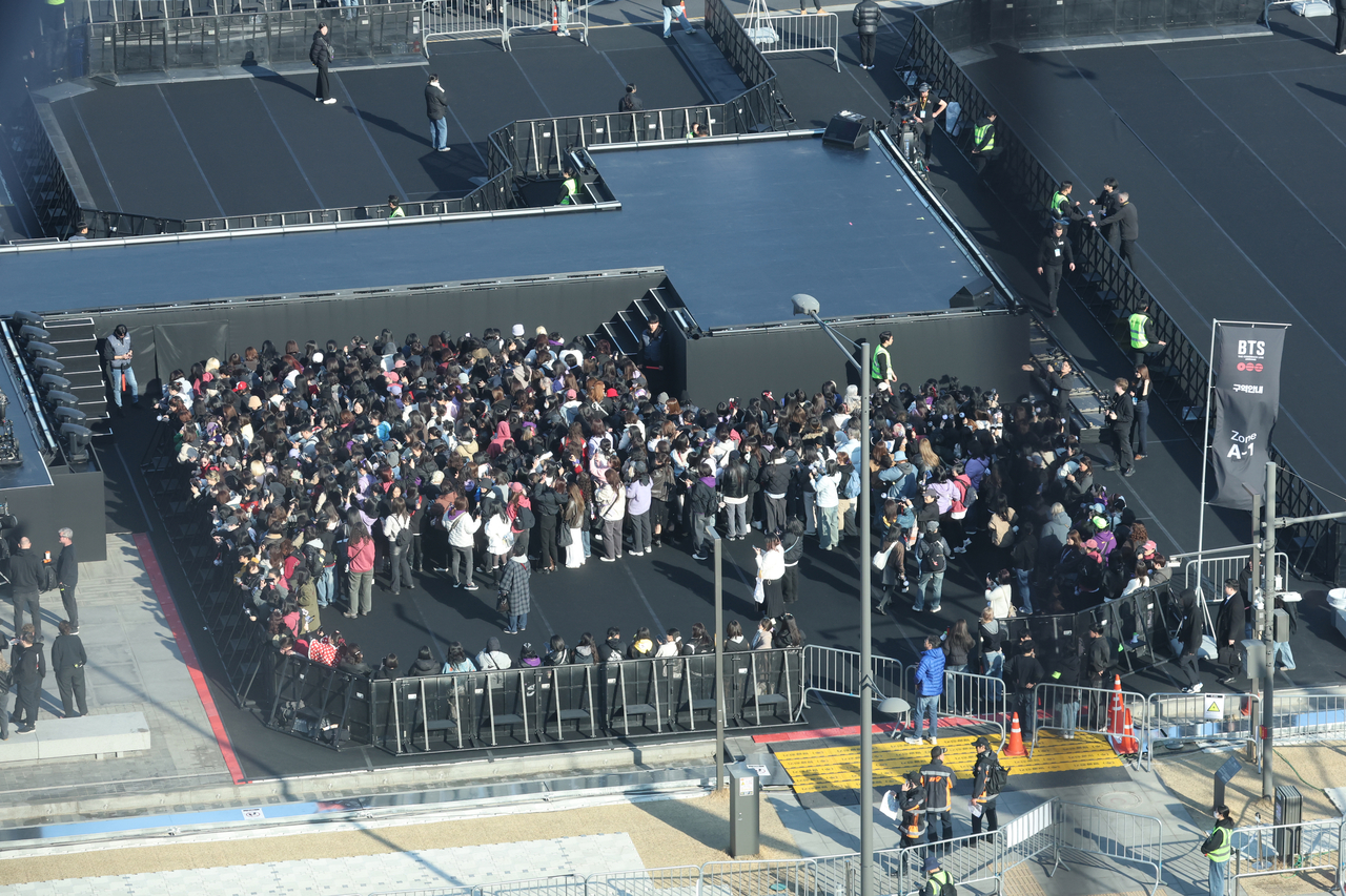 | ‘BTS 컴백 라이브: 아리랑’(BTS THE COMEBACK LIVE|ARIRANG)이 열리는 21일 서울 광화문광장 공연장에서 관객들이 객석에 입장하고 있다. [연합] |