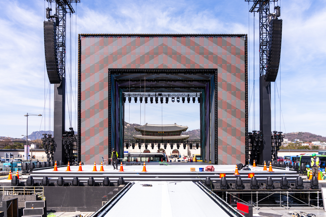 큐브형 구조물로 꾸며 광화문을 배경 삼은 무대 규모가 압도적이다. 지붕의 최고 높이는 5층 건물과 맞먹는 14.7m에 달하며 무대 너비는 17m다. 이곳에 설치된 전력 케이블의 길이만 9.5㎞. 넷플릭스 측은 “방탄소년단 공식 응원봉(아미밤) 4만1536개를 일렬로 이은 것과 같은 길이”라고 했다.