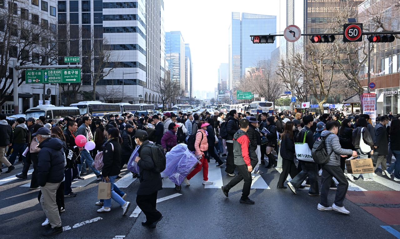 | 21일 서울 광화문 광장에서 그룹 방탄소년단(BTS)의 ‘BTS 컴백 라이브: 아리랑’(BTS THE COMEBACK LIVE | ARIRANG) 무료 복귀 공연이 예정된 가운데 광화문광장 인근 횡단보도가 사람들로 가득 차 있다. 방탄소년단은 이날 공연에서 1시간에 걸쳐 신곡과 히트곡을 들려줄 예정이다. 이상섭 기자 |
