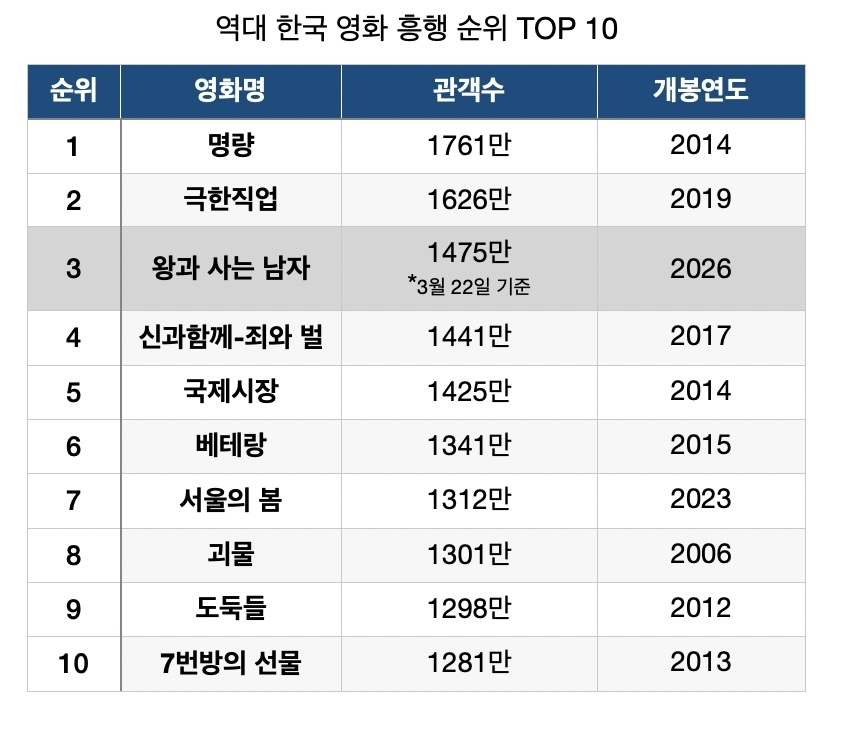 23일 영화진흥위원회 통합전산망에 따르면 영화 ‘왕과 사는 남자’는 지난 주말(20일~22일) 80만3679만 관객을 동원하며 누적 관객수 1475만7122명을 기록했다. 이로써 ‘왕사남’은 역대 한국 영화 흥행 순위 3, 4위 자리를 지켜 온 ‘신과함께-죄와 벌’(1441만)과 ‘국제시장’(1426만)을 제치고 3위 자리에 안착했다. 역대 최고 흥행 외화인 ‘어벤져스: 엔드게임’(1397만명)의 성적도 뛰어넘었다.