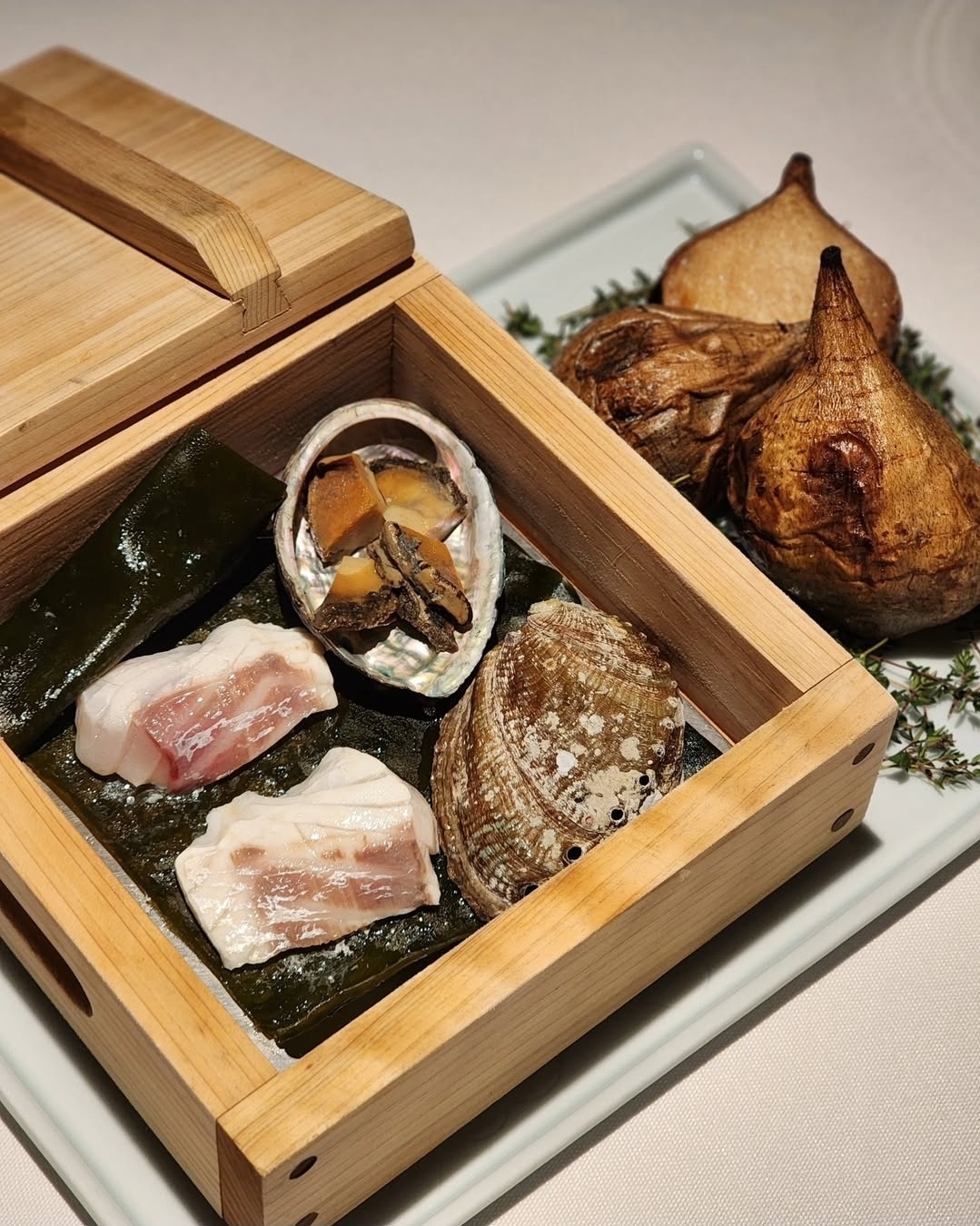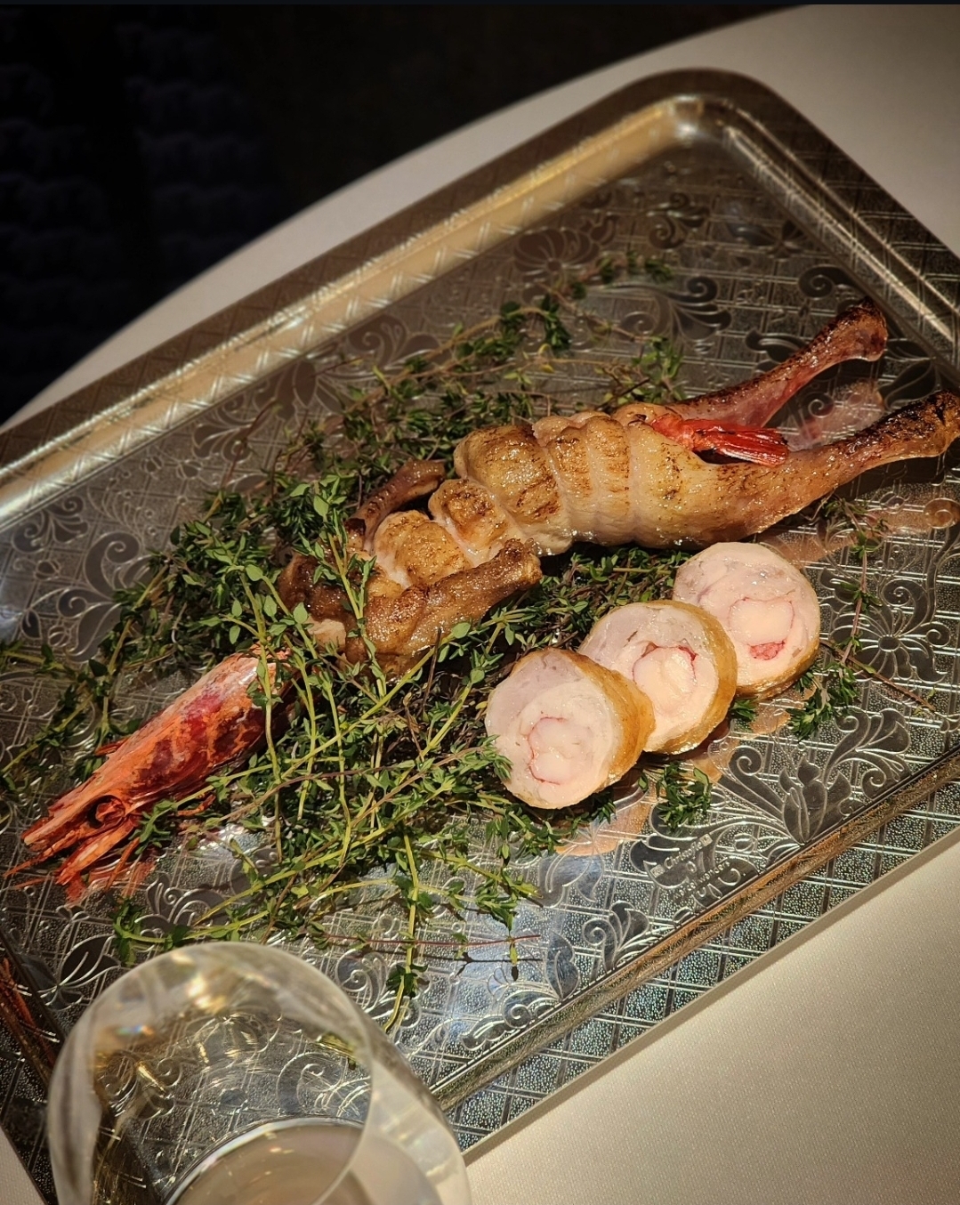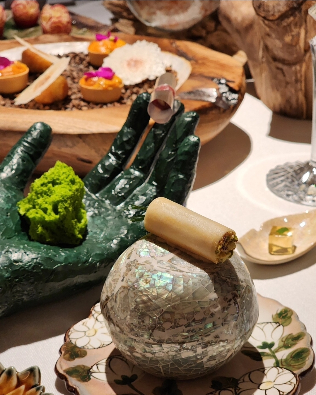 강민철 셰프의 이런 철학은 테이블 위에 고스란히 드러난다. 그 중에서도 첫 순서에 해당하는 아뮤즈 부쉬(amuse-bouche)는 등장만으로 압도적인 인상을 남긴다. 순백의 테이블을 캔버스 삼아 올려진 아뮤즈 부쉬는 예술작품과 같다. 한국에 존재하는 파인다이닝 중에서도 아뮤즈 부위가 주는 첫 인상만큼은 최고이지 않을까. 조각과 같은 다양한 오브제 위에 올라간 음식들은 샴페인과 함께 페어링해 시각적으로뿐 아니라 미각적으로도 화려하고 화사한 쾌감을 선사한다.