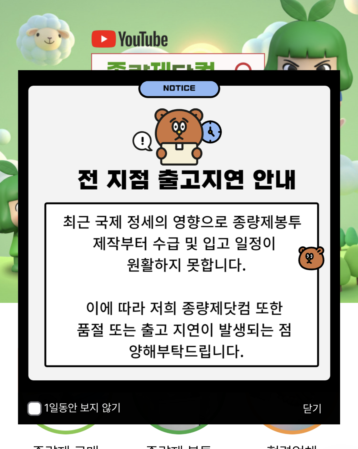 | 종량제 봉투를 판매하는 온라인 몰 ‘종량제닷컴’에 ‘전 지점 출고지연 안내’ 공지가 올라와 있다. 박연수 기자 |