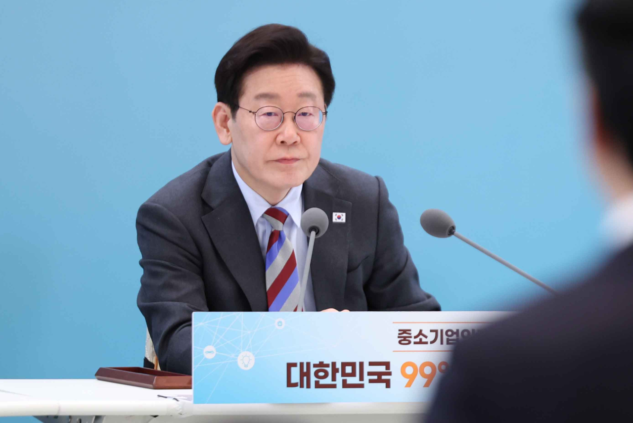 | 이재명 대통령이 20일 청와대 영빈관에서 열린 중소기업인과의 대화에서 참석자 발언을 듣고 있다. [연합] |