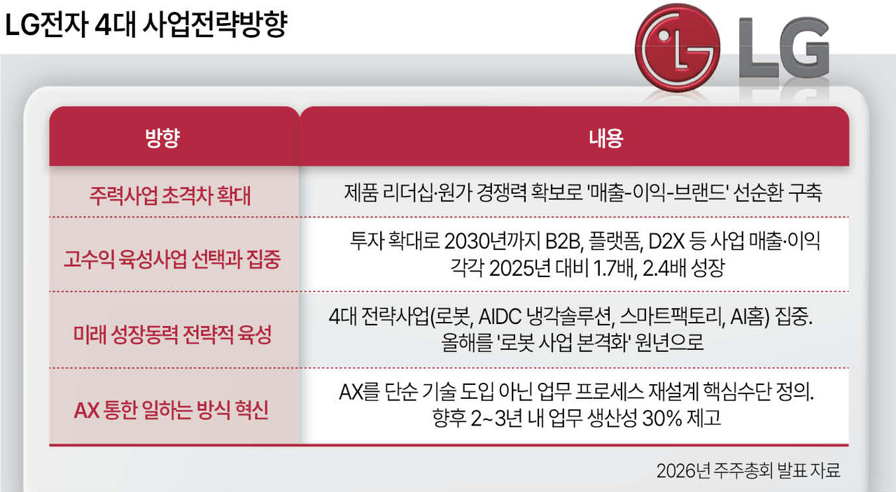 ▶주력사업 초격차 등 4대 전략 제시=류 CEO는 네 가지 전략 방향을 소개했다. ▷주력사업의 초격차 확대 ▷B2B(기업간거래), 플랫폼, D2X(고객직접경험) 등 고수익 육성사업에 선택과 집중 ▷미래 성장동력의 전략적 육성 ▷AX(AI 전환)를 통한 일하는 방식 혁신이다.