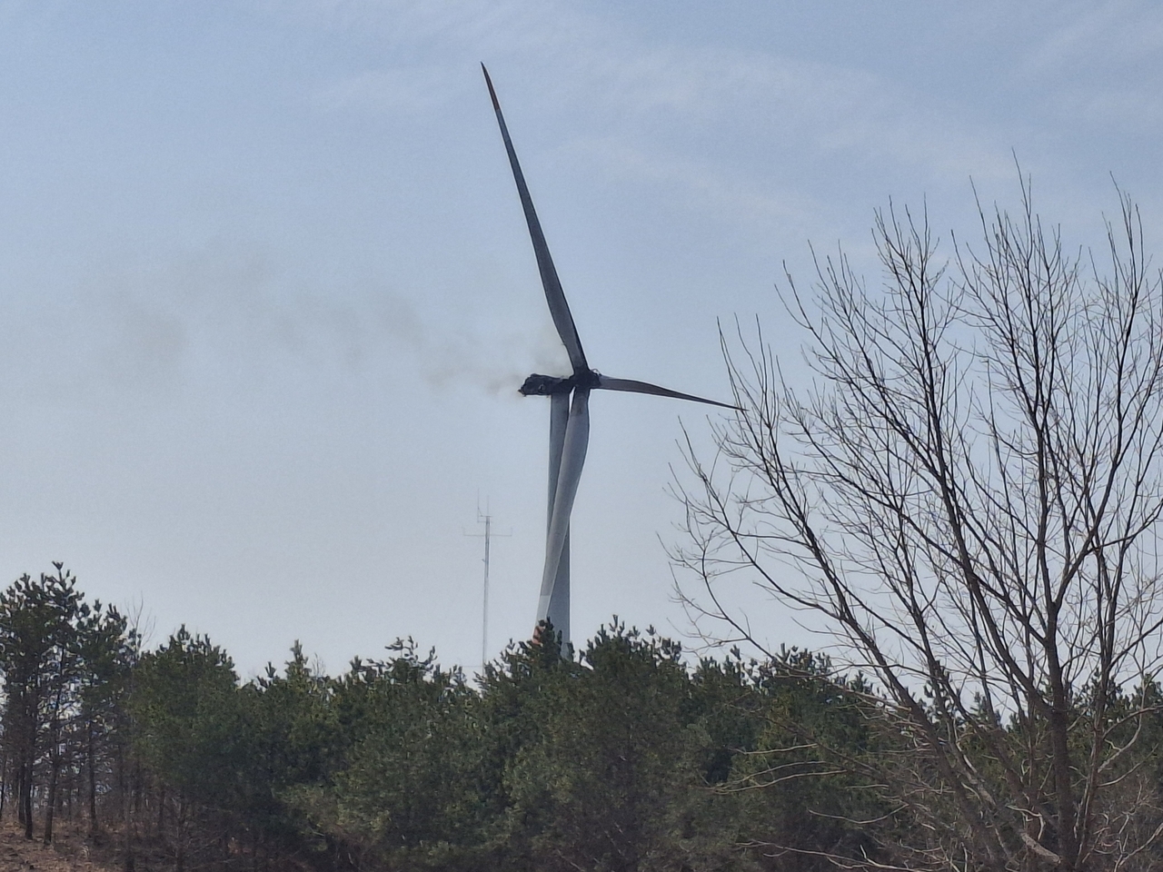 | 연기가 피어오르는 풍력발전기 모습.[경북소방본부 제공] |