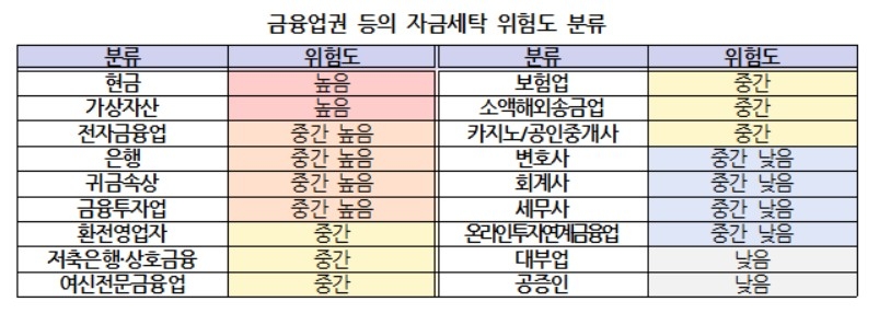 | 금융업권 등의 자금세탁 위험도 분류 [금융정보분석원 제공] |