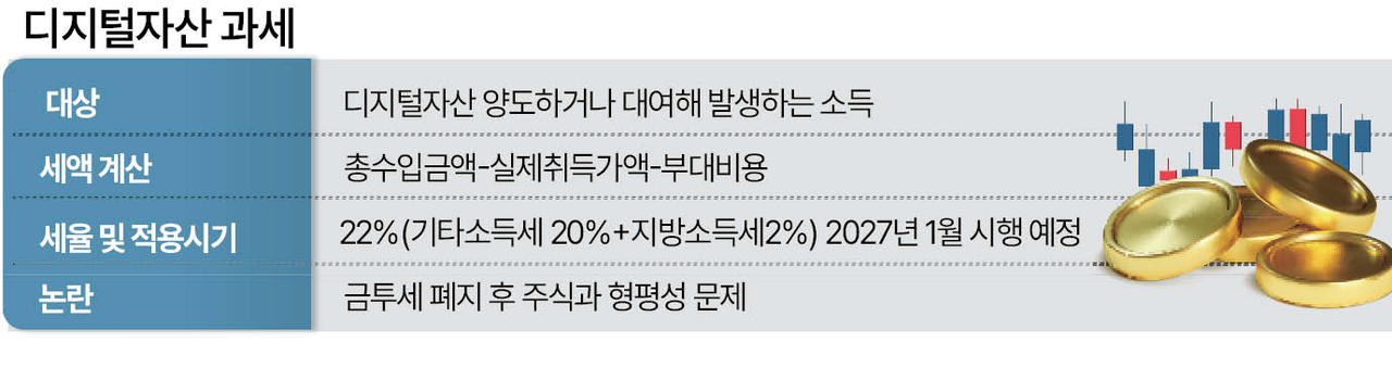 내년부터 개인투자자의 디지털자산 양도차익에 과세가 시행되는 가운데 야당이 이를 폐지하는 법안을 추진한다. 금융투자소득세가 폐지된 상황에서 주식과 디지털자산 간 과세 체계 형평성에 문제가 있다는 이유에서다. 당국은 형평성 논란을 인지하고 있지만 소득 있는 곳에 과세가 필요하다는 입장이다.