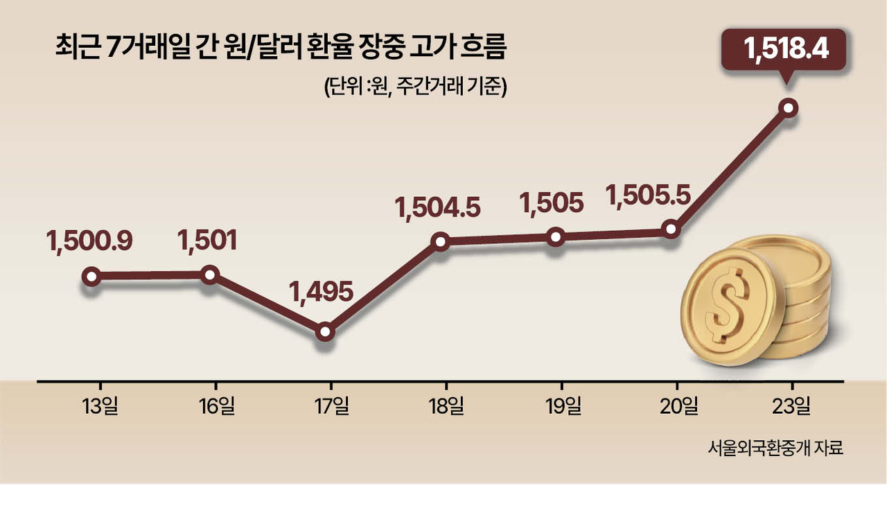 특히 전날 환율은 1504.9원에서 출발한 뒤 오후 들어 급격히 상승폭을 키워 장중 1518.4원까지 찍었다. 이는 글로벌 금융위기 당시인 2009년 3월 10일(장중 1561.0원) 이후 가장 높은 수준이다.