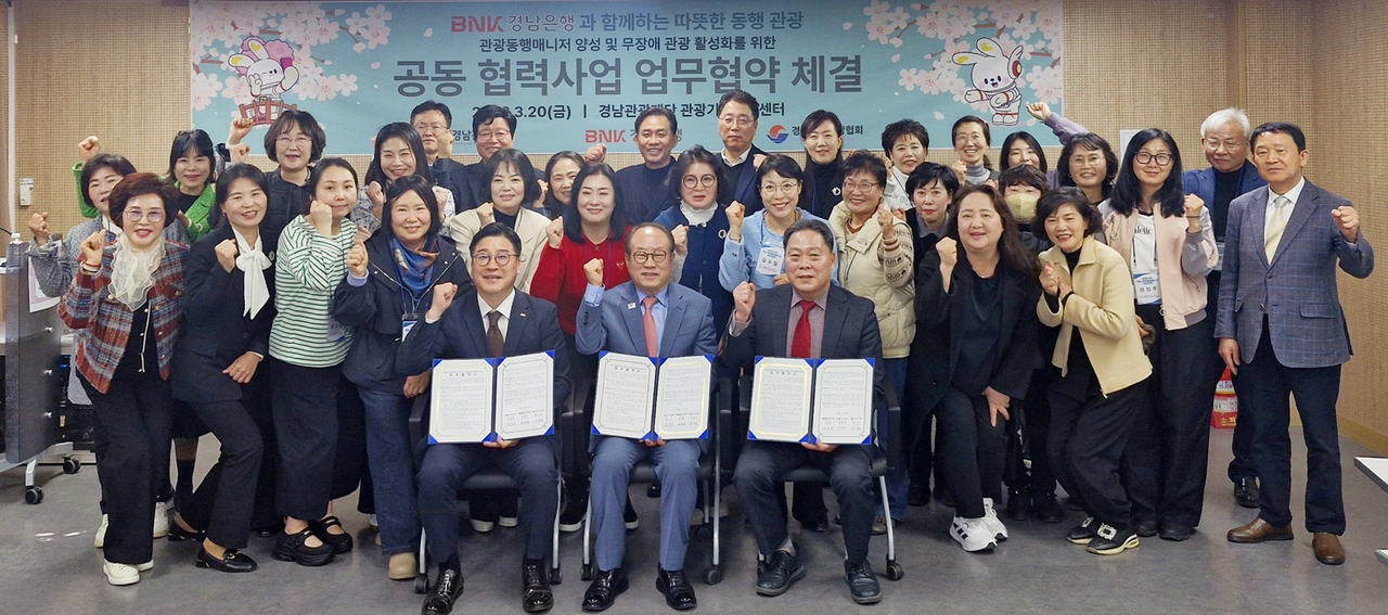 BNK경남은행은 24일 경남관광기업지원센터에서 경남관광재단, 경남관광협회와 ‘경남형 관광동행매니저 양성 및 무장애 관광 활성화를 위한 업무협약’을 체결했다. 이날 협약식에는 각 기관 대표를 비롯해 제1기 관광동행매니저 양성 교육 교수진과 교육생 등 40여 명이 참석했다.