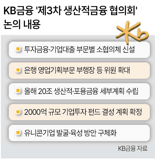 KB금융이 매년 2000억원씩 5년간 1조원 규모의 기업투자 모펀드를 조성한다. 이를 통해 청년기업을 적극 지원하고 지역 기업의 자금 발판 역할을 한다는 계획이다. 20조원 규모의 생산적·포용금융 예산도 기업대출에 가장 많은 12조원을 쏟기로 구체화했다.