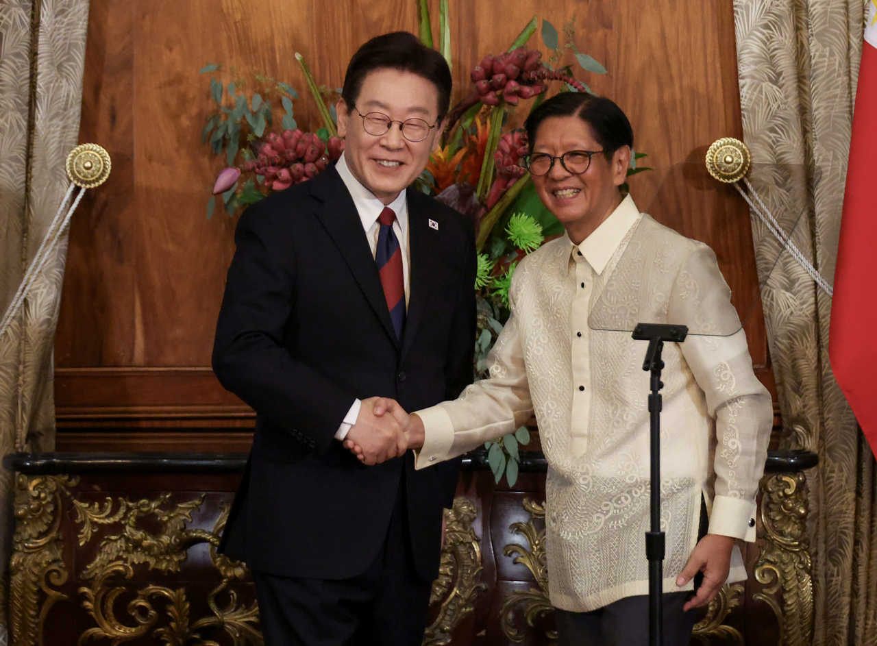 | 이재명 대통령과 페르디난드 마르코스 필리핀 대통령이 3일 마닐라 말라카냥궁에서 공동언론발표를 마친 뒤 악수하고 있다. [연합] |