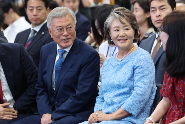 | 문재인 전 대통령과 김정숙 여사가 작년 6월 18일 서울 강남구 코엑스에서 열린 2025 서울국제도서전의 ‘2025 한국에서 가장 좋은 책 시상식’에서 참석자와 대화하는 모습. [연합] |