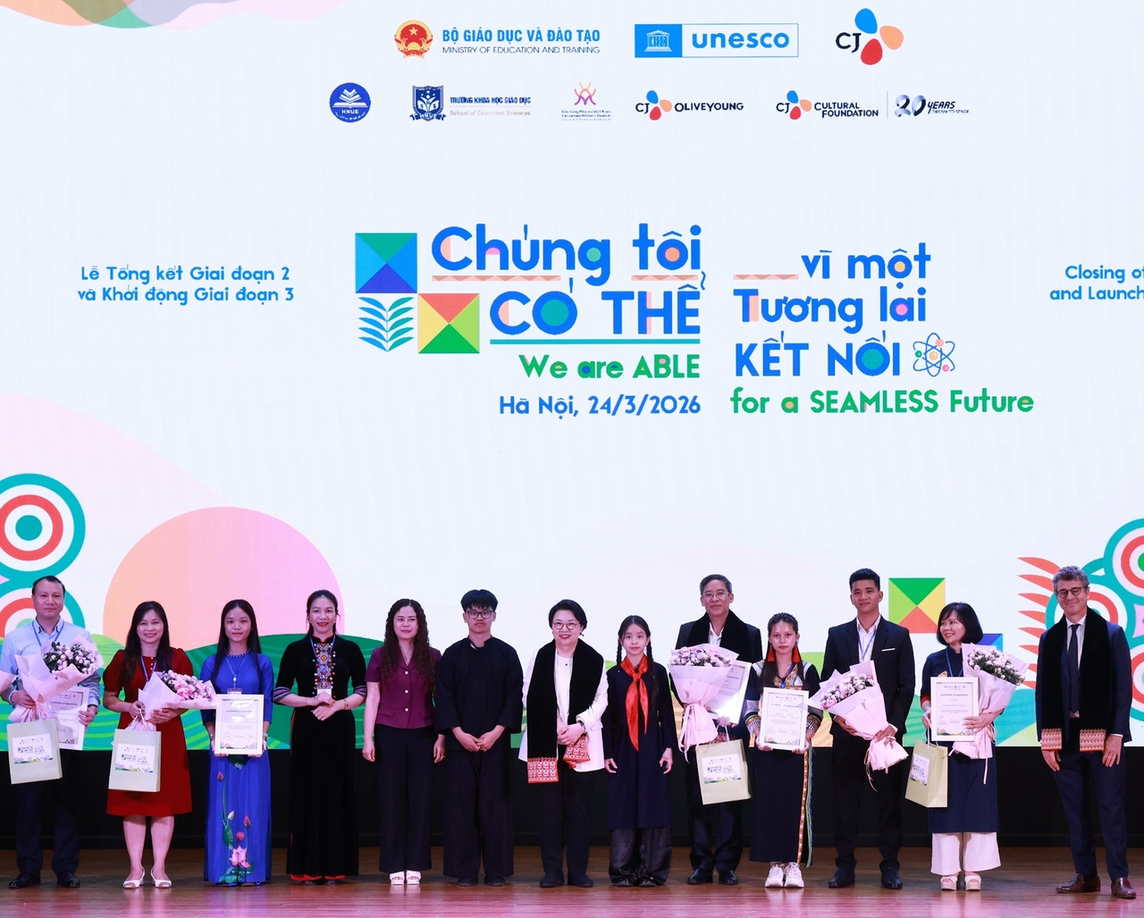 | CJ는 지난 24일(현지시간) 베트남 하노이 국립 교육대학교에서 베트남 정부와 유네스코 관계자, 학생 등 1000여 명이 참석한 가운데 ‘베트남 소녀교육 3차 프로젝트(We Are ABLE Phase 3)’ 출범식을 진행했다. 사진은 민희경(가운데) CJ사회공헌추진단장 등 관계자들이 기념사진을 촬영하는 모습. [CJ 제공] |