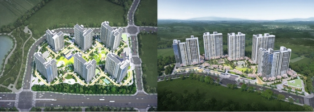 | <고덕국제신도시 수자인풍경채 1,2단지 조감도, (좌)1단지, (우)2단지> |