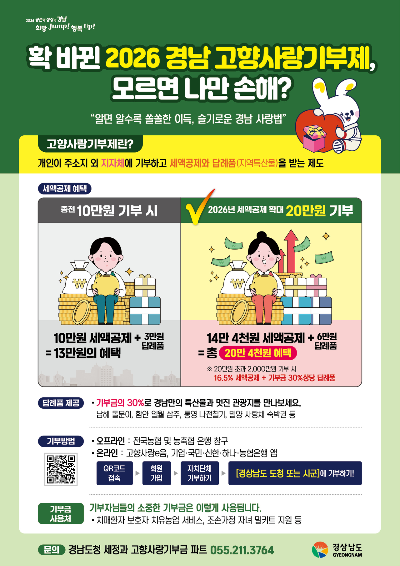 백종철 경남도 세정과장은 “세액공제 구간 확대를 계기로 고향사랑기부에 대한 관심이 더욱 커질 것으로 기대한다”며 “기부금이 지역사회 곳곳에 의미 있게 쓰이도록 실효성 있는 기금 사업을 발굴하고, 경남의 매력을 담은 답례품 구성에도 최선을 다하겠다”고 밝혔다.