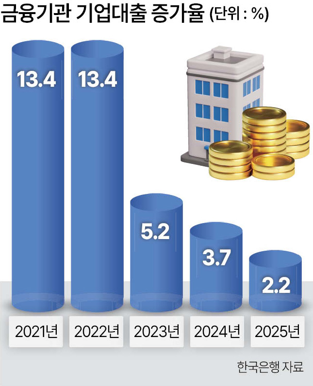 26일 한국은행이 발표한 ‘금융안정상황(3월)’에 따르면, 지난해 국내 기업대출은 1949조원으로 전년(1908조원)보다 2.2% 증가한 데 그쳤다. 기업대출 증가율은 2021년과 2022년 각각 13.4%를 기록했지만, 2023년 5.2%로 둔화된 이후 하락세가 이어지고 있다. 업권별로 보면 비은행권 대출은 0.1% 감소한 반면 은행권 대출은 3.2% 증가하는 수준이었다.