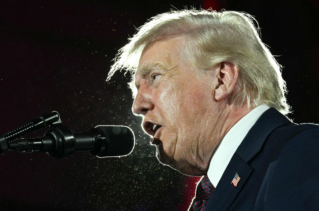 | 25일(현지시간) 워싱턴DC 유니온역에서 열린 공화당의회위원회(NRCC) 연례 대통령 만찬에서 도널드 트럼프 미국 대통령이 연설하고 있다.[AFP] |