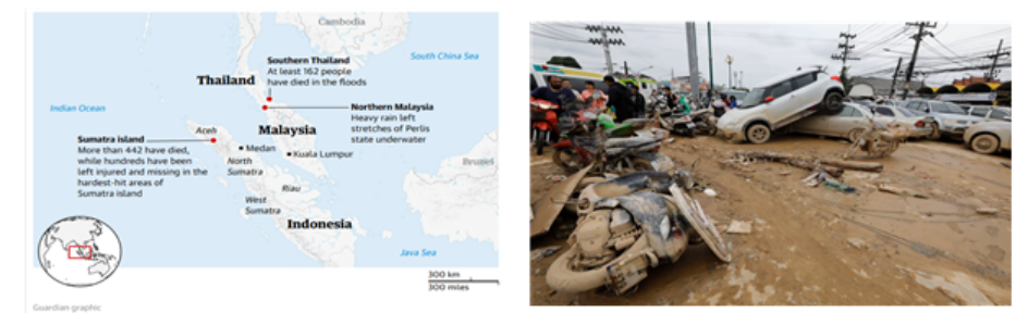 | 인도네시아(수마트라), 말레이시아, 태국 지역의 피해 현황(왼쪽)과 태국 남부 핫야이(Hat Yai) 홍수 피해 [더 가디언 캡처] |