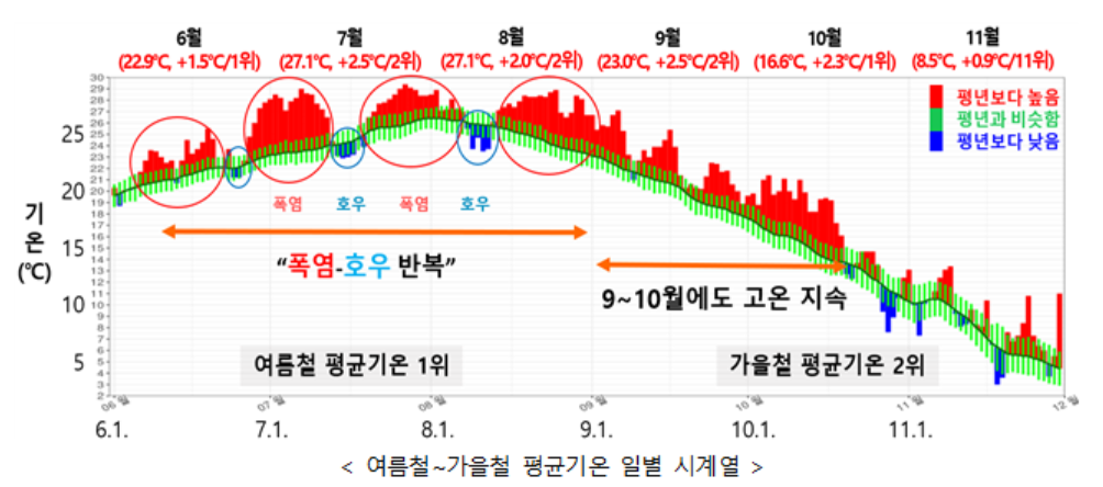 | 여름철~가을철 평균기온 일별 시계열 [기상청 제공] |