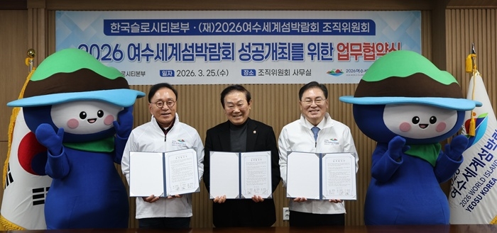 [헤럴드경제=박대성 기자] 2026여수세계섬박람회 조직위원회(공동위원장 권한대행 여수부시장 정현구, 공동위원장 박수관)와 한국슬로시티본부(국제슬로시티연맹 부회장 겸 한국슬로시티본부 이사장 손대현)는 25일 박람회의 성공적 개최와 지속 가능한 섬 발전을 위해 업무협약(MOU)을 체결했다고 밝혔다.