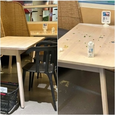 공개된 사진 속에는 식사를 마친 테이블 아래에 이케아 쇼핑 바구니가 덩그러니 방치되어 있으며, 테이블 위 역시 먹다 남은 음식물과 쓰레기로 어지럽혀진 상태다.