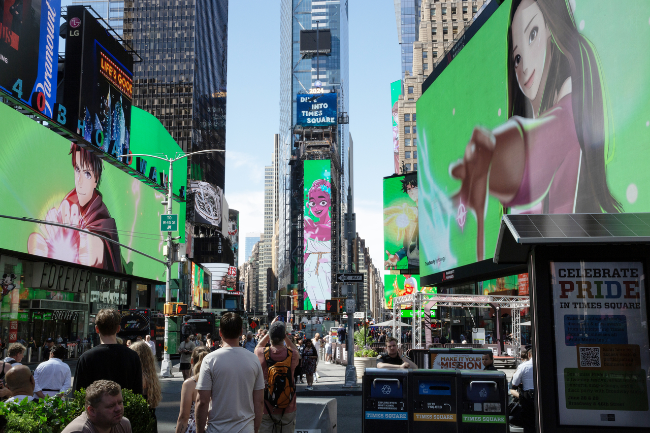 | 2024년 나스닥 상장을 기념해 진행한 웹툰 엔터테인먼트의 뉴욕 타임스퀘어 이벤트 모습. [네이버웹툰 제공] |