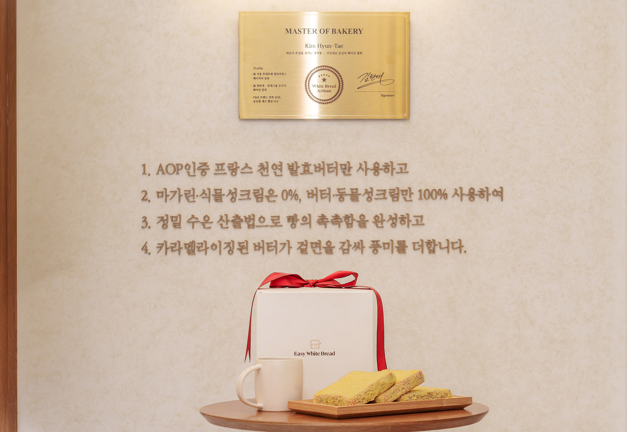 이지화이트 브레드가 선택한 메뉴는 ‘식빵’이다. 일상에서 부담 없이 즐길 수 있는 빵이다. 기본 생식빵을 중심으로 올리브치즈, 윌넛호밀, 소보로밤찰떡 등 4개 메뉴로 간결하게 구성했다.