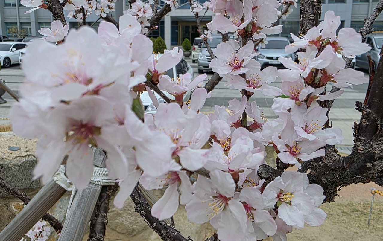 | 완연한 봄 날씨를 보인 25일 울산시청 광장에 앵두나무꽃이 활짝 펴 봄소식을 전하고 있다. [뉴시스] |